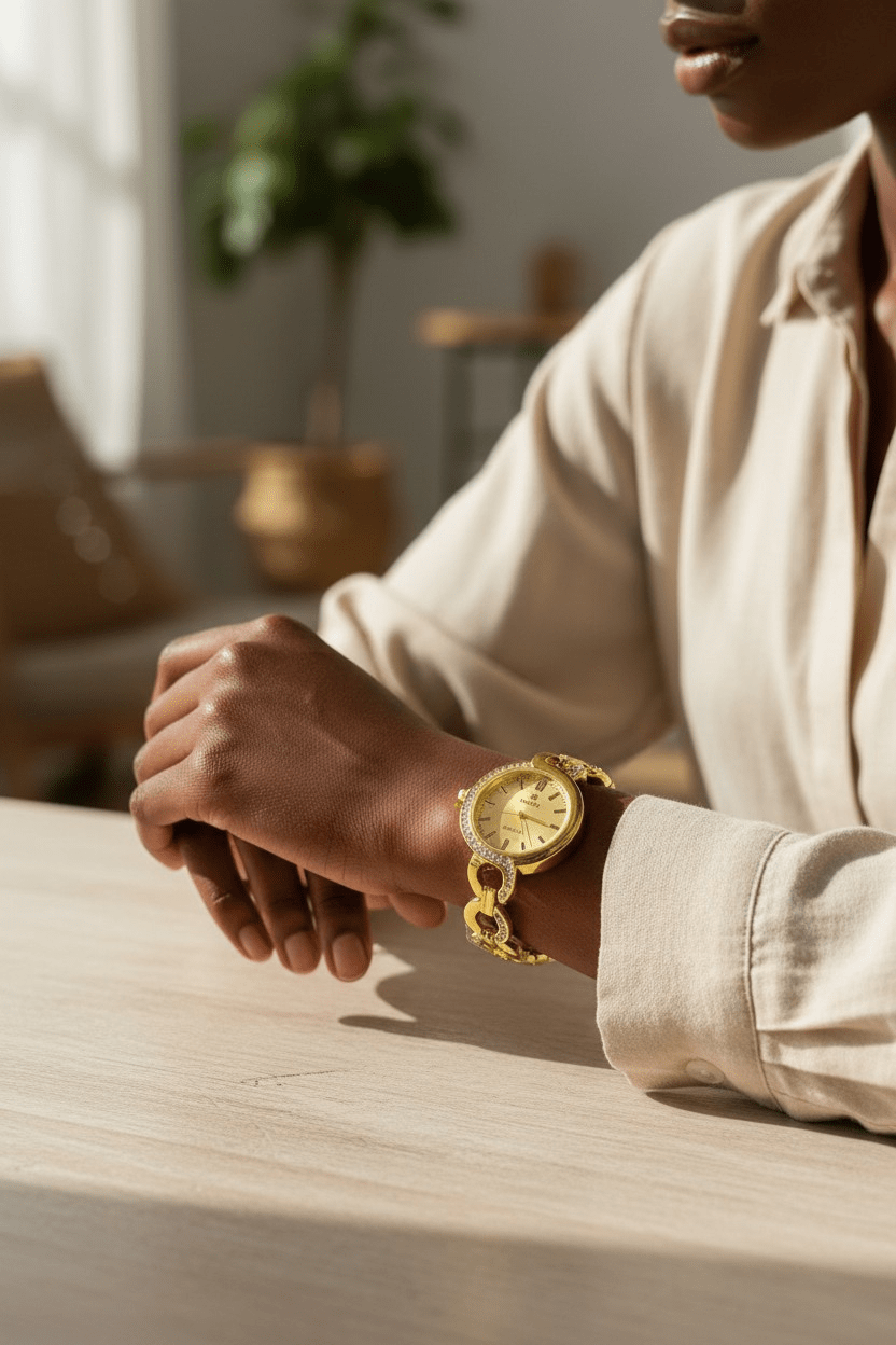 Designed with a radiant gold finish and sparkling crystal-studded bezel, this watch adds a touch of luxury to both casual and formal outfits. Whether she’s heading to work, church, dinner, or a special occasion, this watch completes her look effortlessly.