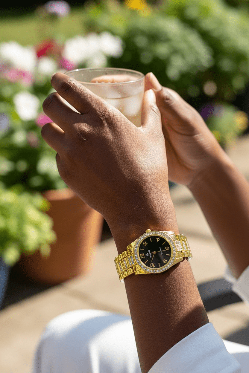 Designed with a radiant gold finish and sparkling crystal-studded bezel, this watch adds a touch of luxury to both casual and formal outfits. Whether she’s heading to work, church, dinner, or a special occasion, this watch completes her look effortlessly.