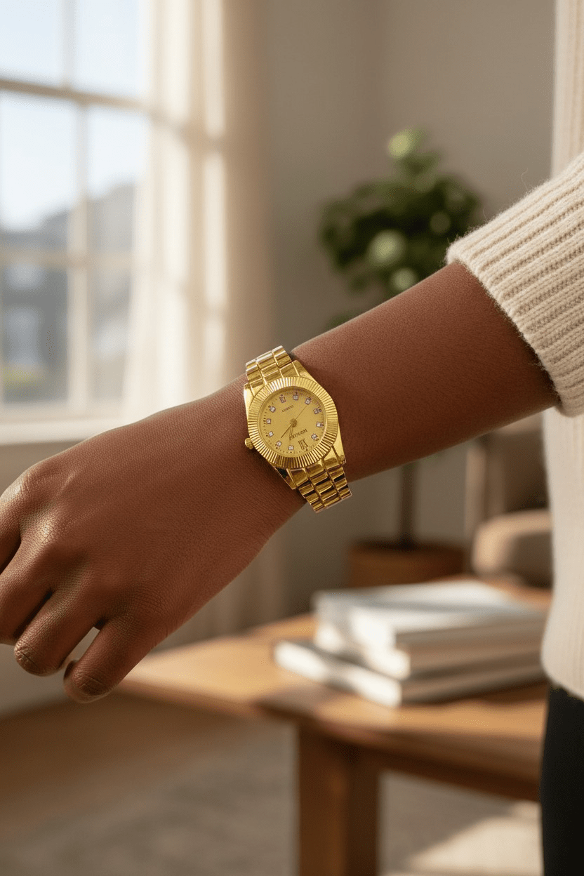 Designed with a radiant gold finish and sparkling crystal-studded bezel, this watch adds a touch of luxury to both casual and formal outfits. Whether she’s heading to work, church, dinner, or a special occasion, this watch completes her look effortlessly.