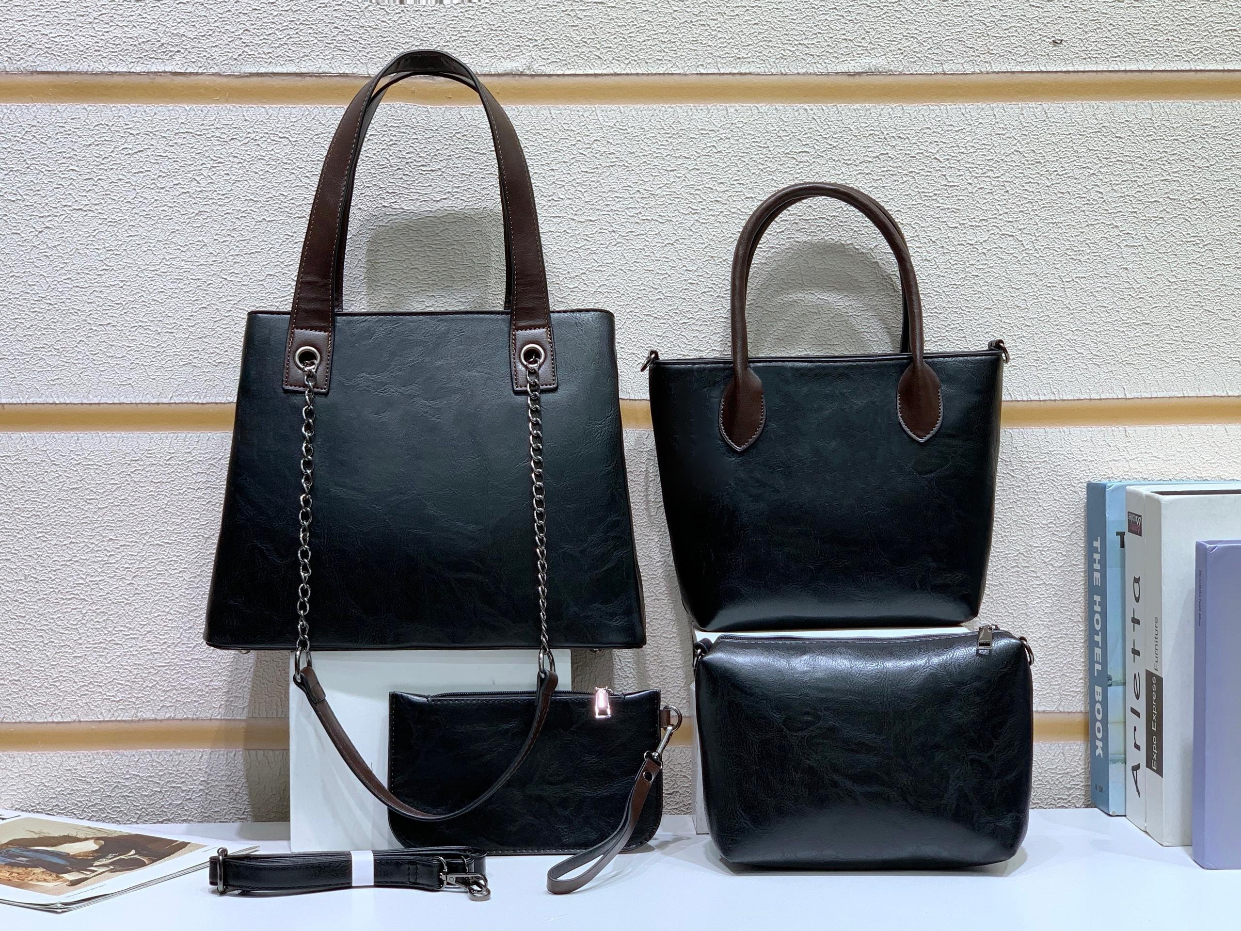 This elegant 4-piece brown leather handbag set is designed for women who appreciate timeless style and everyday functionality. The collection includes a spacious tote with chain strap, a structured handbag with rounded handles, a sleek zippered clutch, and a compact wristlet—perfect for organizing essentials with sophistication. Whether for work, errands, or special occasions, this coordinated set adds polish to any outfit.