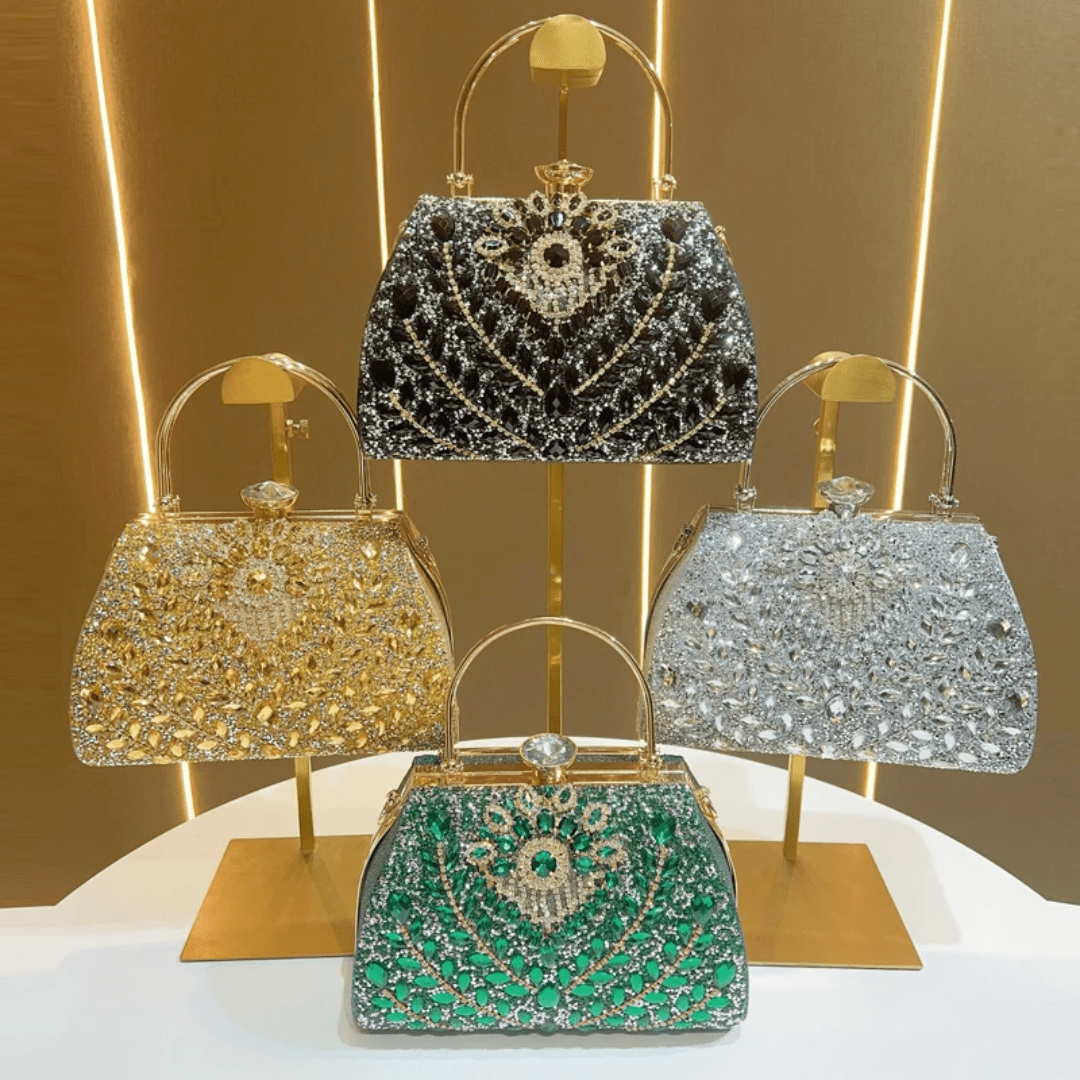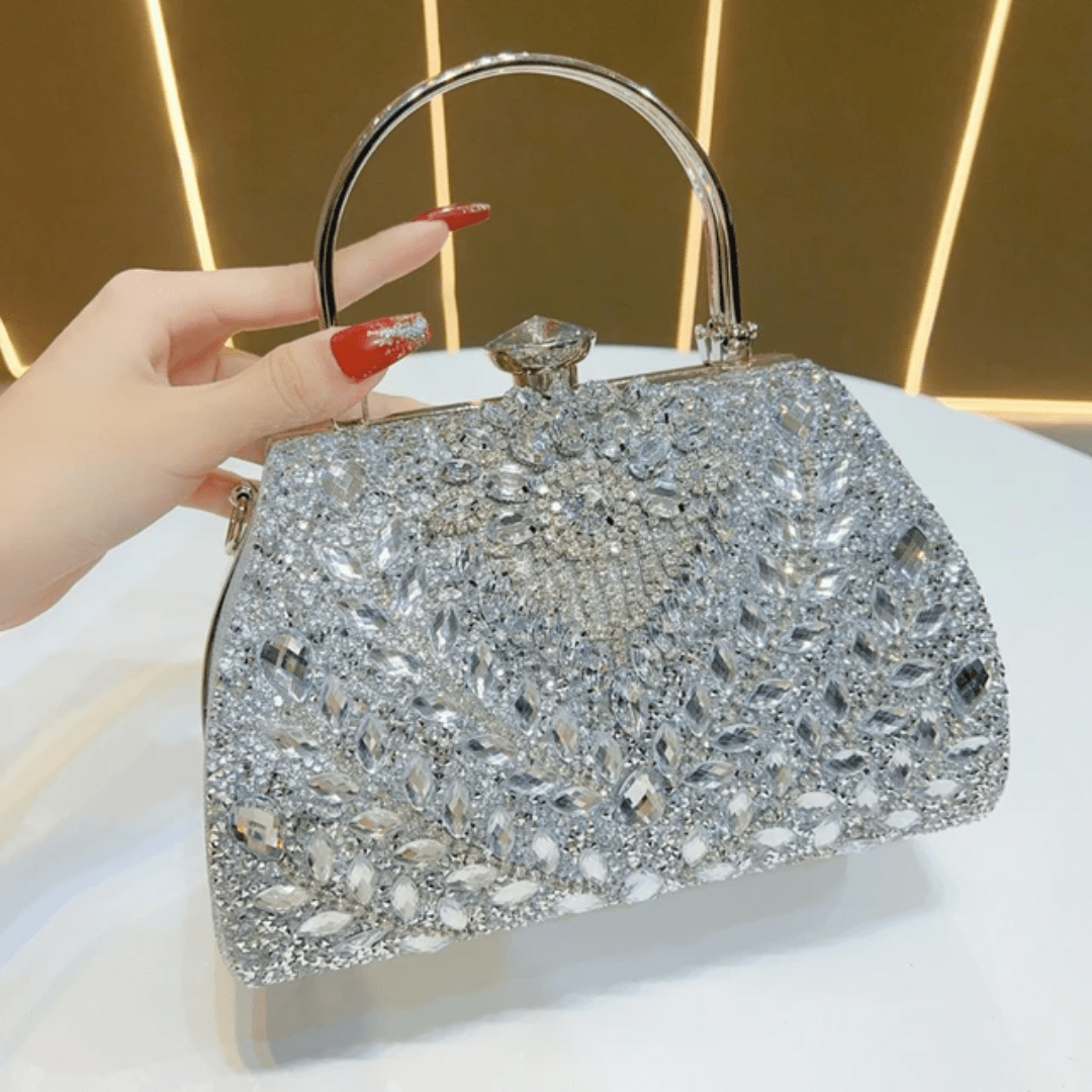 – Jeweled clasp and structured frame for a vintage-inspired look