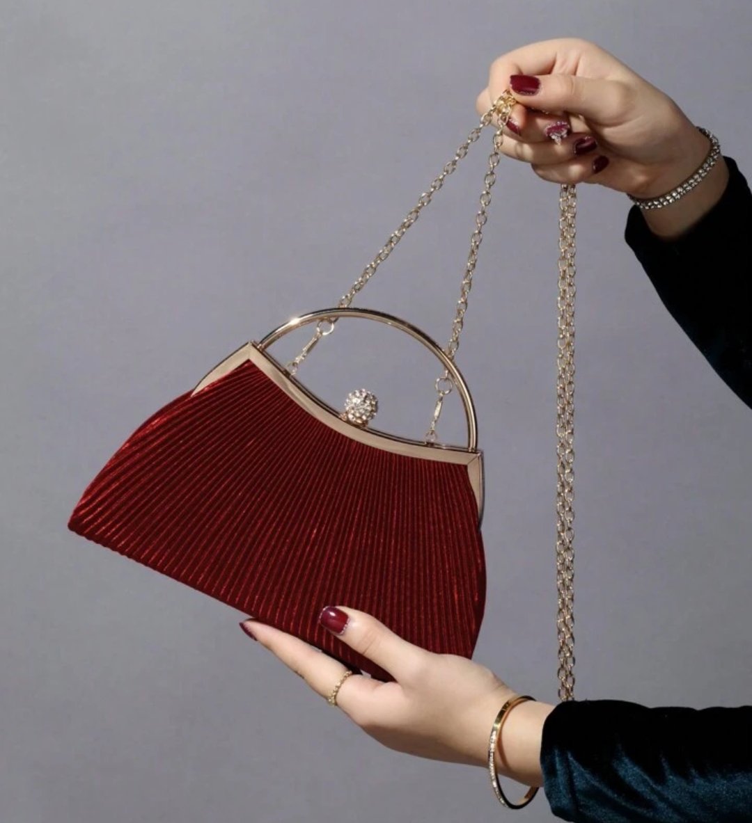 This elegant pleated handbag is a timeless accessory crafted for women who love bold sophistication. Featuring a structured gold frame, jeweled clasp, and dual carrying options—a curved metal handle and detachable chain strap—it transitions effortlessly from day to evening. The rich texture and vibrant color make it a standout piece for formal events, dinners, or stylish outings.