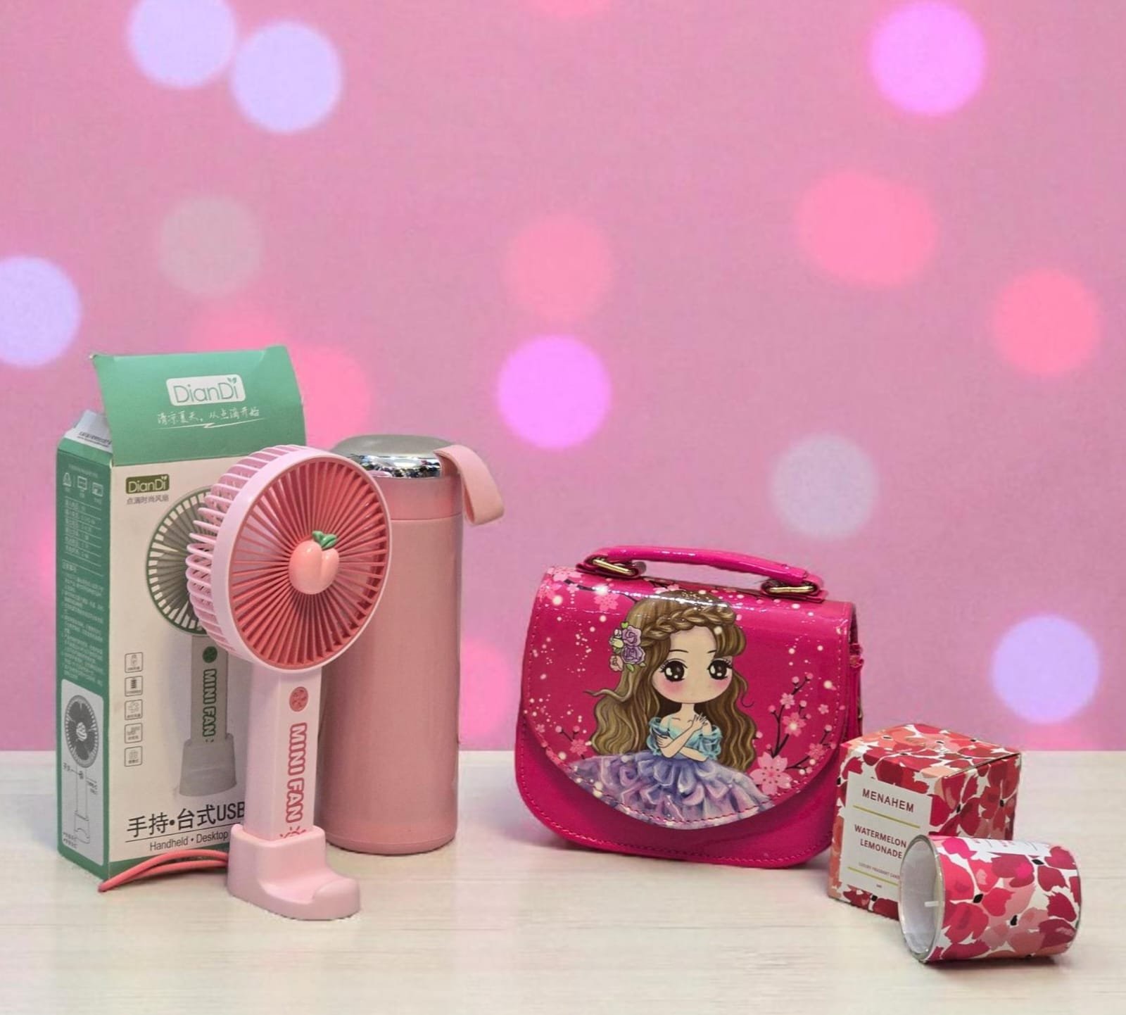 Surprise a special girl with this charming 4-piece birthday gift set featuring a Disney-themed handbag, handheld fan with stand, 400ml bottle, and scented candle. A delightful present for daughters, nieces, cousins, or granddaughters.