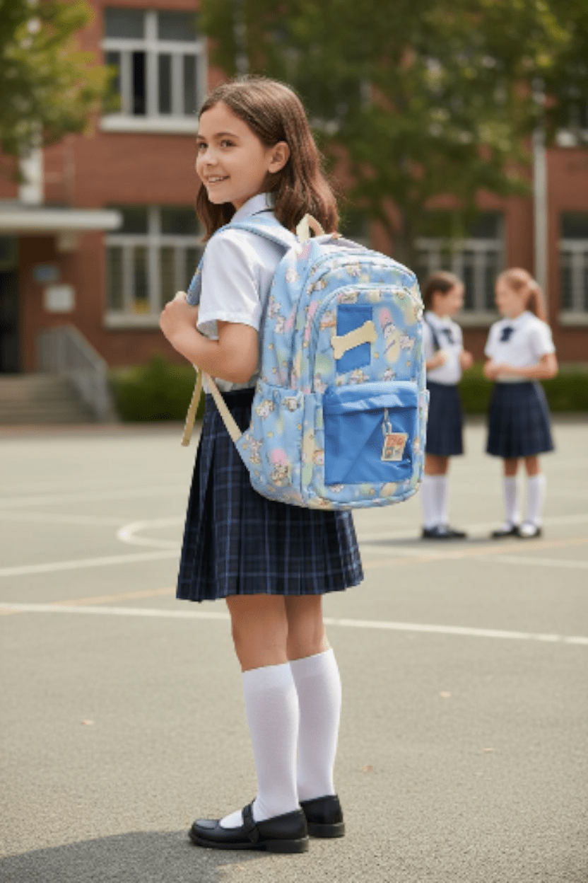 PawKet™—a light blue cartoon backpack with bone prints, roomy compartments, and comfy straps for stylish, pet-loving schoolgirls.