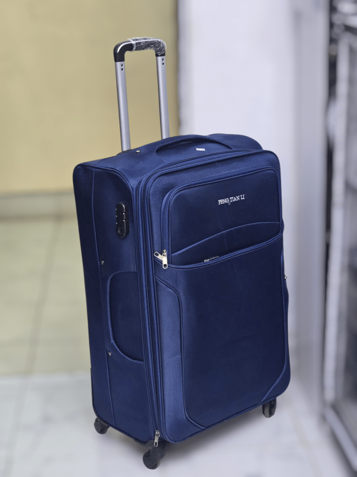 Strong and durable suitcase Made of tough fabric Has four rotating wheels on each piece Strong handle that is easy