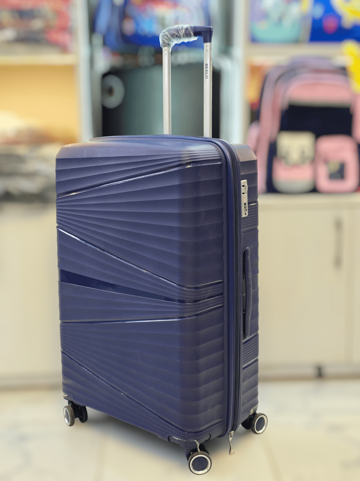 Description Stylish travel suitcase made from durable fabric 360°-degree wheels for convenient movement Navyblue in color Strong handles Large and