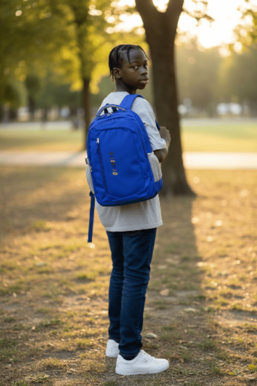 SkyStride™—a bright blue school bag with roomy compartments and comfy straps. Unisex, stylish, and birthday-ready.