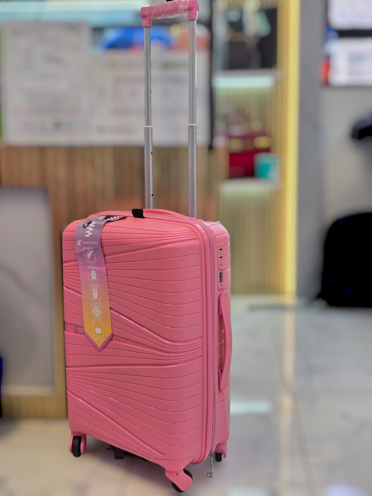 Small size travel suitcase Has 4 wheels on each piece Strong handle and wheels wheels rotate 360° Has an outside