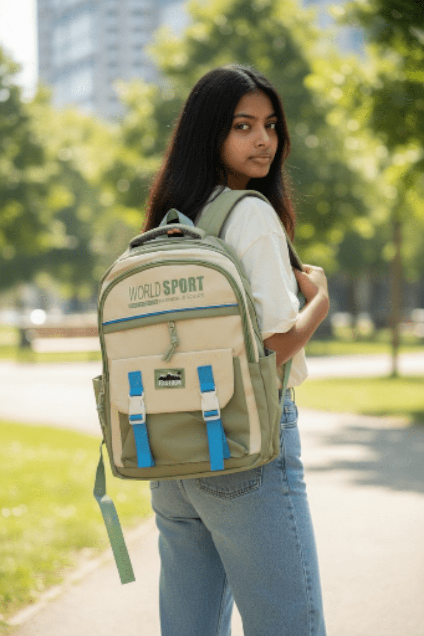 WaiPack™ World Sport School bag & College Backpack – green & white with Buckle Detail