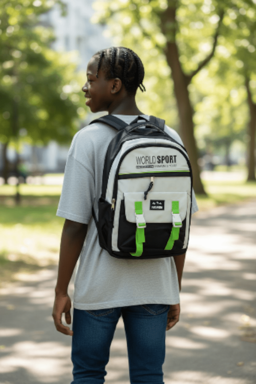 WaiPack™ World Sport School bag & College Backpack – Black & white with Buckle Detail